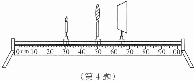 4. 在探究"凸透镜成像规律"的实验中,蜡烛、凸透镜和光屏在光具座上的位置如图所示,此时在光屏上得到烛焰清晰的像. 若保持凸透镜位置不动,将蜡烛移到光具座的 35 cm 刻度处,对于此时像的性质判断正确的是(
