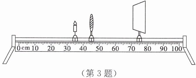 3.D [解析]图中物距为45.0 cm-35.0 cm=10.0 cm,凸透镜的焦距是10.0 cm,物距等于焦距,不能成像,只向左或向右移动光屏,光屏上不能呈现蜡烛的像,A、B错误;只向右移动蜡烛至适当位置,物距小于焦距,成正立、放大的虚像,光屏上不能呈现蜡烛的像,C错误;将凸透镜移动到55.0 cm处,物距为55.0 cm-35.0 cm=20.0 cm,像距为75.0 cm-55.0 cm=20.0 cm,此时u=v=2f,光屏上能呈现烛焰等大的像,D正确.