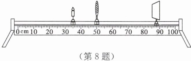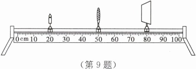 9. 如图所示,烛焰在光屏上刚好成清晰的像. 透镜不动,将蜡烛移至 35 cm 刻度处,移动光屏,在光屏上能观察到(