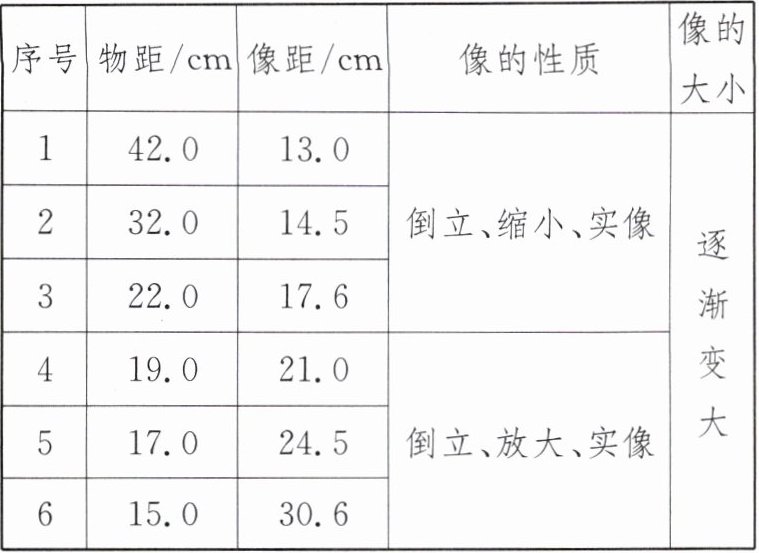 |序号|物距/cm|像距/cm|像的性质|像的大小|