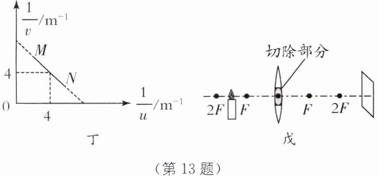 (5)如图戊所示,将蜡烛放在图示位置,光屏上恰好成清晰的像,若切除凸透镜中间的阴影部分,再将剩余部分靠拢在一起,则蜡烛能成