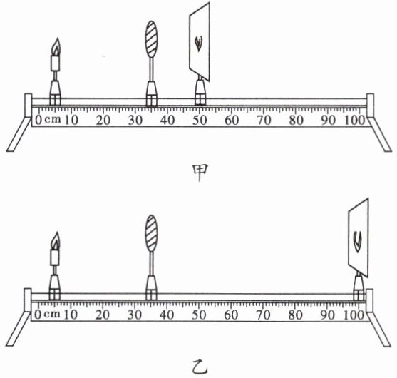 13. 控制变量法 在探究凸透镜成像规律时,如图甲所示,将 A 凸透镜固定在光具座上 35 cm 刻线处,将点燃的蜡烛放置在光具座上 5 cm 刻线处,移动光屏使烛焰在光屏上成清晰的像,将凸透镜 A 换为凸透镜 B 并保持蜡烛和凸透镜位置不变,移动光屏使烛焰在光屏上成清晰的像,如图乙所示.