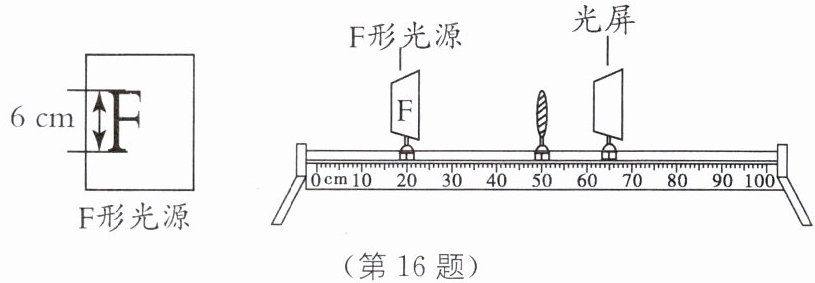 16. 中考新考法 过程开放性实验 (2024·贵州中考)如图所示,用焦距为 10 cm 的凸透镜、高度为6 cm 的 F 形光源、光屏和光具座等器材探究凸透镜成像大小的变化规律,通过测量像的高度反映像的大小.