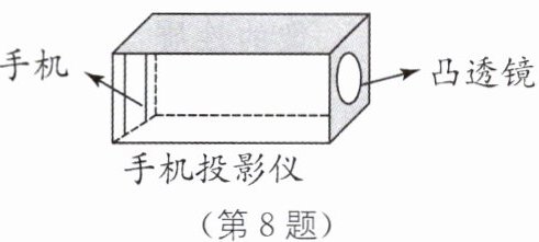 8. (2024·聊城中考)在学习了凸透镜成像规律后,小慧同学计划制作一个"手机投影仪".现有器材如下:焦距分别为10 cm、20 cm、30 cm的凸透镜各一个,手机一部,长为30 cm的纸盒,胶带和剪刀等."投影仪"模型如图所示,将手机和凸透镜分别固定在纸盒的两端,调整"投影仪"到墙面的距离,可在墙上看到手机画面清晰放大的像.下列说法正确的是(