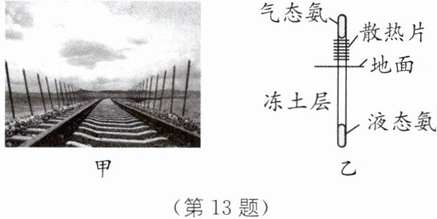 13. 教材P103图4-20·变式 (2024·包头中考)我国的青藏铁路是世界上海拔最高的铁路.在冻土区的铁路两侧安装有许多热棒,如图甲所示.热棒是封闭的中空长棒,上端装有散热片,下端插在冻土中,里面填充低沸点的液态氨作为“制冷剂”,如图乙所示.液态氨通过与气态氨的相互变化过程,带走冻土层热量,使冻土层保持低温不会融化,保护路基.请根据以上信息回答下列问题: