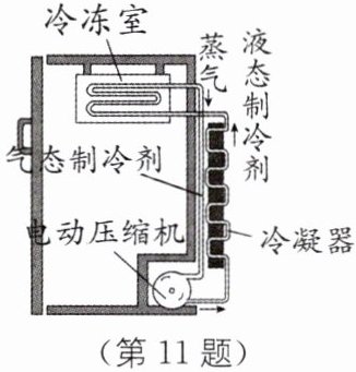 11. 跨学科 冰箱中的热现象 (2025·南京期末改编)兴趣小组的同学对电冰箱的制冷原理进行了跨学科实践.经过研究发现电冰箱利用制冷剂作为热的“搬运工”,制冷剂在电动压缩机的驱使下,在密封的管道内循环流动,将冰箱内的热量带到冰箱外,达到制冷的目的.