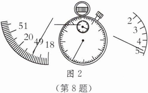 (2)由题图2知,秒表的小表盘是分针盘,分针指在"4"和"5"之间,且靠近"5",大表盘为秒针盘,分度值为0.1 s,对应刻度为49.1 s,所以秒表的示数为4 min 49.1 s即289.1 s.