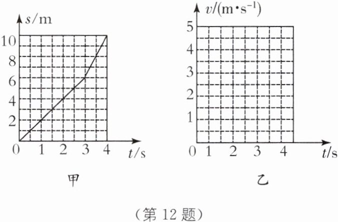 12. (2024·常州溧阳期末)一物体沿直线运动,它在 0~4 s 内的路程 s 随时间 t 变化的图像如图甲所示,请在图乙中画出该物体在 0~4 s 内的速度随时间 t 变化的图像.