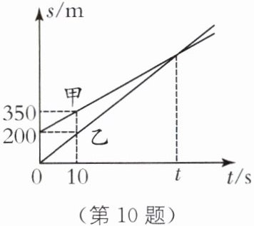 72 40 [解析]由题图可知,$t = 10s$时,$s_{甲}=350m - 200m=150m$,$s_{乙}=200m$,则$v_{甲}=\frac{s_{甲}}{t_{甲}}=\frac{150m}{10s}=15m/s$,$v_{乙}=\frac{s_{乙}}{t_{乙}}=\frac{200m}{10s}=20m/s = 72km/h$。设乙车追上甲车需要的时间为$t'$,$v_{甲}t'+200m = v_{乙}t'$,即$15m/s× t'+200m = 20m/s× t'$,解得$t' = 40s$。