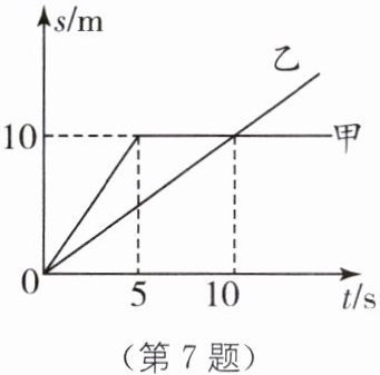 D [解析]由图像可看出甲车在5~10s内通过的路程为零,处于静止状态,故A错误;由图像可看出乙车在0~10s内通过的路程为10m,所以乙车在0~10s内的速度是$v_{乙}=\frac{s_{乙}}{t_{乙}}=\frac{10m}{10s}=1m/s$,乙车的图像是一条斜线,表示乙车做的是匀速直线运动,所以在0~5s内乙车的速度是1m/s,故B错误;由图像可知,$t = 10s$时,甲车静止,速度为零,乙车的速度是1m/s,两车的速度不相等,故C错误;由图像可知,两车在10s末相遇,$t = 10s$后,甲车仍静止,乙车超过甲车,故D正确。故选D。