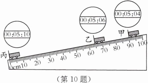 10. 图示法 某物理兴趣小组利用带有刻度尺的斜面、小车和秒表“测量小车的平均速度”,如图所示,图中显示他们测量过程中的小车在甲、乙、丙三个位置及其对应时间的情形,显示时间的格式是“时:分:秒”.