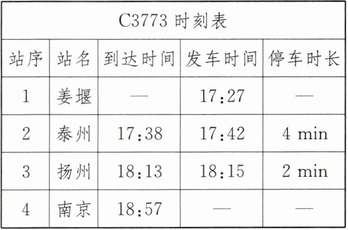(1)泰州的发车时间为 17:42,到达扬州的时间为 18:13,列车从泰州到扬州运行的时间为 31 min.