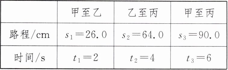 (2)平均速度是用总路程比总时间,即方法 1 正确.甲至丙的平均速度$v_{3}=\frac {s_{3}}{t_{3}}=\frac {90.0cm}{6s}=0.15m/s$.