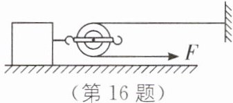 16.C [解析]物体在水平地面上匀速运动,重力的方向竖直向下,物体没有在重力的方向上通过一定的距离,重力做功为零,故A错误;图中滑轮是动滑轮,拉力移动的距离s'=2s,拉力做功W=Fs'=F×2s=2Fs,故B错误;摩擦力做功W_{摩}=fs,故C正确;使用动滑轮可以省力,由功的原理可知,使用任何机械都不省功,则使用此滑轮不能省功,故D错误.故选C.