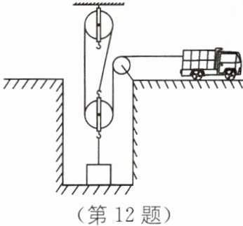 12. 如图所示是一辆汽车通过滑轮组将深井中的物体拉至井口的装置图.已知井深10 m,物体重$G= 4×10^3N,$汽车重G车$= 3×10^4N,$汽车匀速拉绳子时的拉力$F= 2×10^3N,$汽车受到的阻力为车重的0.05.问: