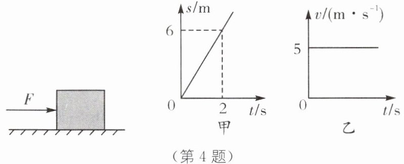 4. 物体在同一水平面上做匀速直线运动,当物体运动路程与时间的关系图像如图甲所示时,受到的水平推力为$F_{1}$;当物体运动的速度与时间的关系图像如图乙所示时,受到的水平推力为$F_{2}$.两次推力的功率分别为$P_{1}$、$P_{2}$.则$F_{1}:F_{2}和P_{1}:P_{2}$分别为(