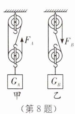 8. (2024·苏州工业园区五校期中)如图所示,用相同的滑轮安装成甲、乙两种装置,分别用拉力$F_{A}$、$F_{B}在相同时间内将重为G_{A}$、$G_{B}$的两个物体匀速提升相同高度,拉力的功率为$P_{A}$、$P_{B}$,绳子自由端移动的距离为$s_{A}$、$s_{B}$,不计绳重和摩擦,下列推理中正确的是(