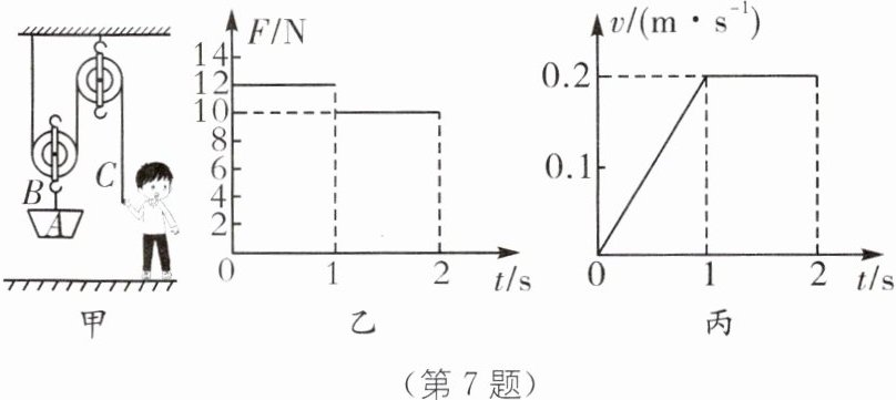 7. 如图甲所示的装置,A 是重为 10 N 的空吊篮,绳子 B 和 C 能承受的最大拉力分别为 100 N 和 60 N.质量为 50 kg 的小张同学将 A 提升到高处,施加的拉力 F 随时间变化关系如图乙所示,A 上升的速度 v 随时间变化关系如图丙所示.忽略绳重及摩擦,g 取 10 N/kg.下列结论正确的是(