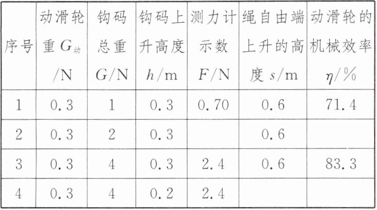 |序号|动滑轮重$G_{动}/N$|钩码总重G/N|钩码上升高度h/m|测力计示数F/N|绳自由端上升的高度s/m|动滑轮的机械效率$\eta/\% $|