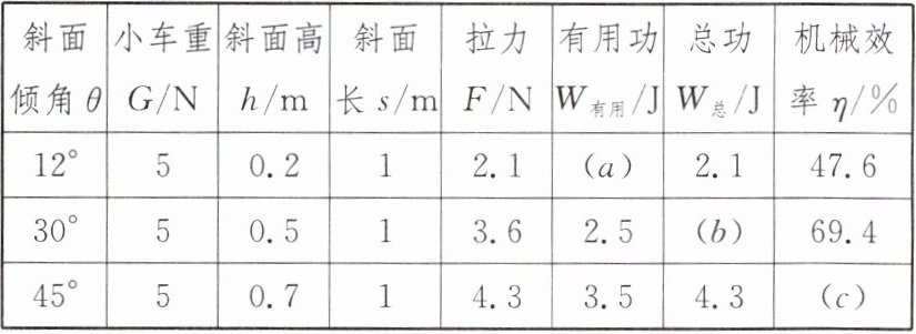 |斜面倾角$\theta $|小车重G/N|斜面高h/m|斜面长s/m|拉力F/N|有用功$W_{有用}/J$|总功$W_{总}/J$|机械效率$\eta/\% $|
