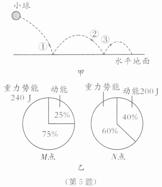 D [解析]根据图乙可知,小球在M点时的机械能为$\frac{240\,\text{J}}{75\%}=320\,\text{J}$;小球在N点的机械能为$\frac{200\,\text{J}}{40\%}=500\,\text{J}$,此时的重力势能为$500\,\text{J}× 60\% = 300\,\text{J}$,所以小球在M点时的重力势能小于小球在N点时的重力势能;小球跳起的高度越来越低,所以机械能是逐渐减小的,N点的机械能大于M点,N点在前面,由图可知,M点只可能是③,N点是②,故A、C错误;M点的动能为$320\,\text{J}-240\,\text{J}=80\,\text{J}$,N点的动能为$200\,\text{J}$,质量不变,动能减小,故球在点③(M)的速度比在点②(N)小,故B错误;小球在点①的机械能大于点②,即大于$500\,\text{J}$,而重力势能与③相同,即$240\,\text{J}$,故动能大于$500\,\text{J}-240\,\text{J}=260\,\text{J}$,故D正确.