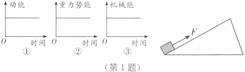 A [解析]木块在拉力作用下沿斜面做匀速直线运动,木块质量不变,速度不变,所以木块的动能不变,即动能不随时间变化,故①正确;木块在拉力作用下沿斜面做匀速直线运动,木块质量不变,高度变大,所以木块的重力势能变大,即重力势能随时间的增加而变大,故②错误;木块动能不变,重力势能变大,所以机械能变大,即机械能随时间的增加而变大,故③错误.故选A.