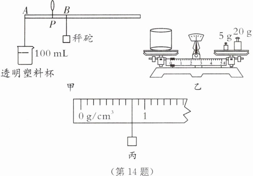 14. (2024·泸州中考)在某届泸州市青少年科技创新大赛中,小明制作的"杆秤液体密度计"如图甲所示,选取了一根质量不计的硬质轻杆,P 为提挂点,P 点的左侧端点 A 处悬挂透明塑料杯,右侧悬挂秤砣,不计细线质量.将相同体积不同密度的待测液体加入杯中,根据杠杆平衡条件可知,杠杆平衡时,秤砣悬挂点到 P 点的距离与待测液体的密度成一次函数关系,即可在杠杆上均匀标出刻度线来测量液体密度.其制作与测量过程中进行了如下操作.(g 取 10 N/kg)