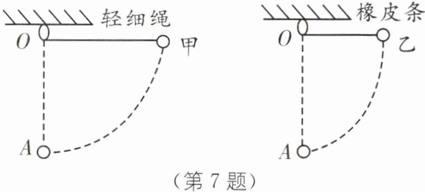 7. 完全相同的甲、乙两个小球,分别用轻细绳、橡皮条系在同一高度的O点,都从与O点等高的位置由静止开始释放(如图所示),当两球到达悬点正下方时,橡皮条长度恰好与细绳长度相等,以下说法正确的是(