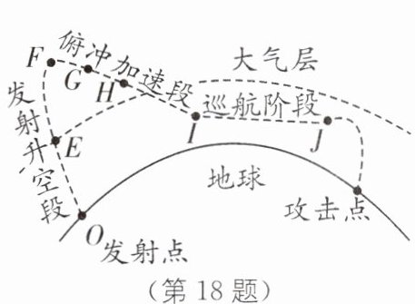 18. 新情境 巡航导弹的飞行轨迹 (2023·潍坊中考)巡航导弹是导弹的一种,具有突防能力强,难以拦截的优点.如图所示为某巡航导弹的飞行路线图,发射升空段,发动机点火,导弹以极快的速度穿出大气层升至高空;俯冲加速段,发动机处于关闭状态,导弹向下俯冲,会被加速到极高的速度;巡航阶段,主发动机的推力与阻力平衡,弹翼的升力与重力平衡,可以实现远距离“巡航状态”,最后精确打击目标.下列关于该巡航导弹的说法正确的是(
