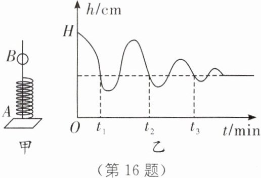 (2)小球离开弹簧后,可以继续向上运动,但是小球每一次反弹的高度逐渐变小,是因为存在空气阻力,在此过程中小球的机械能转化为内能,所以在整个过程中小球的机械能不断减小,t₁、t₂、t₃ 时刻小球的高度相同,重力势能相同,故小球动能最大时是在 t₁ 时刻.