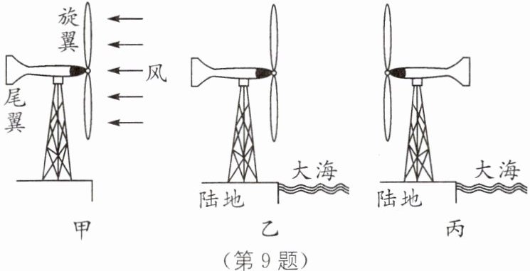 9. 新情境 风力发电机 (2023·常州中考)家用小型风力发电机独特的尾翼结构,能使其旋翼自动迎风,如图甲所示.海边,仅在海陆风因素的影响下,如图乙、丙所示的情形通常分别发生在(