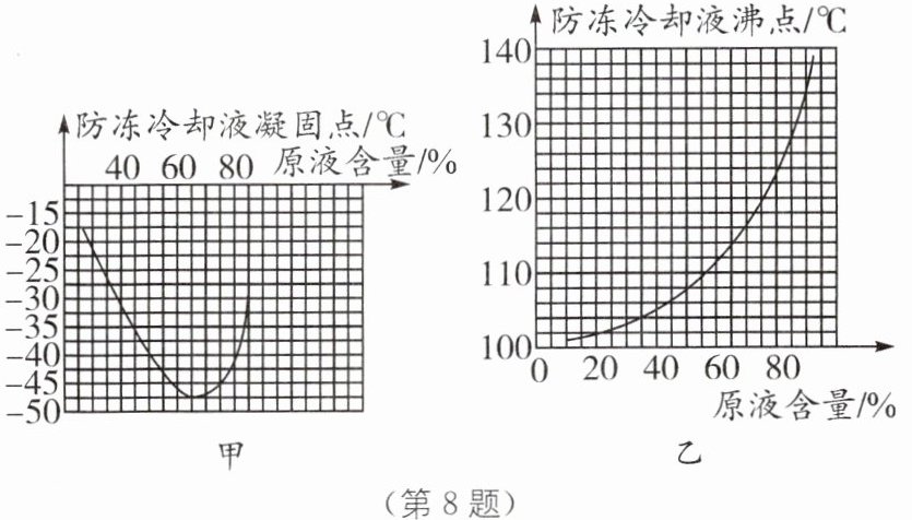 汽车行驶时,发动机的温度会升得很高,利用防冻冷却液在散热器管道内循环流动,将发动机多余内能带走,使发动机能以正常工作温度运转.防冻冷却液主要由水和不易汽化、密度比水小的某种防冻剂(简称原液)混合而成,原液含量(防冻剂占防冻冷却液体积的比例)越高,防冻冷却液的比热容越小,防冻冷却液的凝固点和沸点与原液含量的关系图像如图甲和图乙所示.