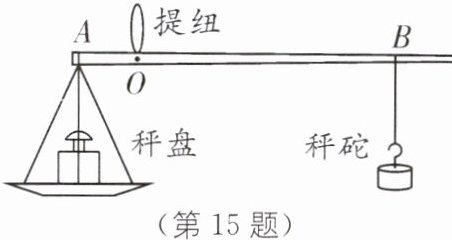 15. (2024·重庆中考)如图所示,同学们模仿中药房的戥秤制作杆秤,用筷子做秤杆,用钩码做秤砣,用细线将秤盘系在 A 点.当不挂秤砣、且秤盘不放物体时,在 O 点提起提纽,秤杆水平平衡;当秤盘放 100 g 物体、秤砣移到 B 点时,秤杆再次水平平衡,如图所示.在 O 到 B 两条刻线之间均匀地画上 49 条刻度线.下列说法正确的是(