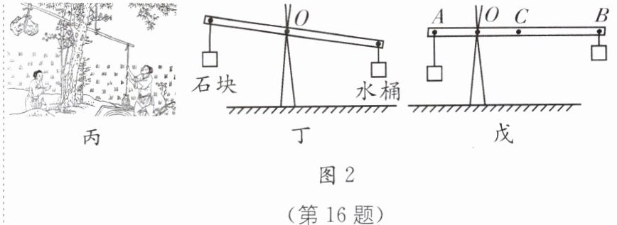 (3)桔槔是我国古代的取水工具,如图2丙所示,在井边竖一根树杈,架上一根横木,横木的一端绑上大石块,另一端系绳和水桶,简化图如图2丁所示.若水桶盛满水后,为减小人向上提水的拉力,根据杠杆的平衡条件,可以______(填"增大"或"减小")石块的质量或向______(填"左"或"右")移动杠杆的支点.