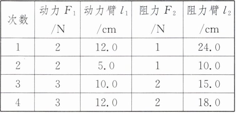 |次数|动力$F_{1}$/N|动力臂$l_{1}$/cm|阻力$F_{2}$/N|阻力臂$l_{2}$/cm|
