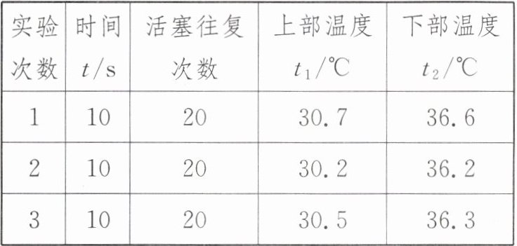 (2)由表中数据可知,打气筒下部温度高于上部温度,说明活塞在打气筒内向下运动时,活塞对筒内的气体做功,气体内能增加,温度升高,造成下部温度高于上部温度,故导致打气筒外壁发热的原因是活塞在筒内往复运动时,不断压缩气体做功.
