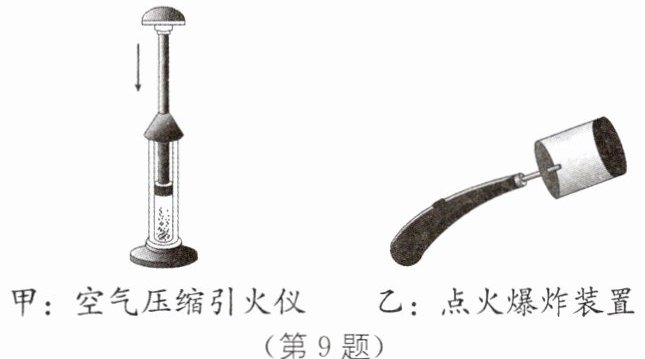 9. 如图所示,图甲中活塞迅速下压后硝化棉燃烧,图乙中点火后盒盖飞出.“活塞压缩空气”和“使盒盖飞出”的两个过程中,对比能量转化情况、改变筒内气体内能的方式和筒内气体内能的变化三个方面,它们(