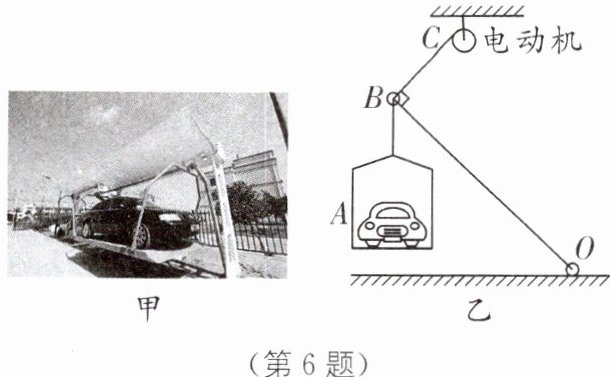 6. 新情境 存车亭的应用 (2025·常州金坛区一模)为解决停车难的问题,街边出现了如图甲所示的“路边空中绿化存车亭”,其工作原理如图乙所示.电动机通过钢丝绳BC牵引杆OB绕O点转动,B端悬挂存车架A.小汽车从图乙所示位置($CB\perp OB$)缓慢下降到水平地面的过程中,钢丝绳对B点的拉力将(