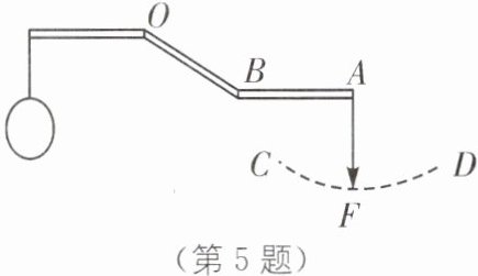5. 如图所示,轻质杠杆可绕O点转动,在A端通过细绳作用一个向下的拉力F,使绳绕A点从D点沿虚线CD顺时针转动至C点,杠杆始终保持平衡,则在此过程F______,F与其力臂的乘积______.(填“变大”“变小”“不变”“先变大后变小”或“先变小后变大”)