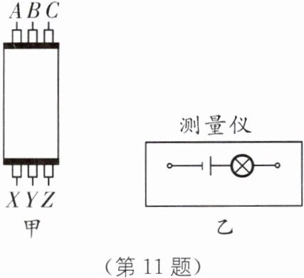 11.(2025·无锡江阴期末)如图甲所示是高层建筑的墙体中有三根绞在一起的电线,可以用如图乙所示的“测量仪”连接在X、Y、Z端把它们区分开.将A和C拧在一起时,当“测量仪”连接在X、Y两端,灯泡发光,则______是同一根电线.接着拆开A和C,将A和B拧在一起,测量仪一端必须与______(填“X”“Y”或“Z”)相连,另一端导线连接______次电路能将导线辨别开.