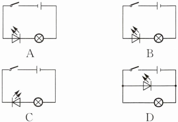 B [解析]由实物图知,LED灯与小灯泡串联,开关控制整个电路,由LED灯的正、负极知,水果电池的左端是其正极,右端是负极.所以电流由电源正极流出依次通过开关、LED灯、小灯泡,回到电源负极,由各选项图可知,B 正确,A、C、D错误.