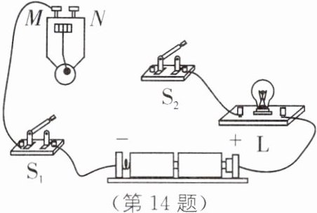 14. 新情境 设计自动防盗报警装置(2023·辽宁沈阳于洪区期末)小明为学校体育器材室设计了一个自动防盗报警装置,其模拟电路如图所示.要求:将开关$S_1、$$S_2$闭合后,灯泡发光,电铃不工作,表示该报警系统已经启动;一旦器材室的门被打开(开关$S_2$断开),电铃就会自动报警.请用笔画线代替导线将如图所示的电路补充完整,使之符合上述功能.(MN为电铃的两个接线柱)