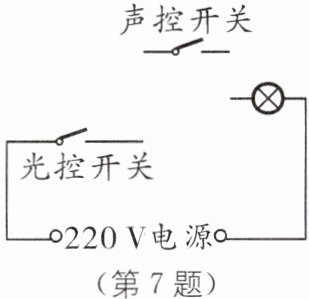 7. 如图所示,楼道里的路灯由“光控开关”和“声控开关”控制,环境光线暗时“光控开关”闭合,有声音时“声控开关”闭合.若只有同时满足天黑和有声音时,灯才会亮,请完成电路连接.