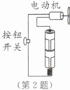 C [解析]由图可知开关、电动机和电源依次连接,是串联的,故A错误;常用导线的材料是铜和铝,铜和铝是导体,故B错误;提供电能的装置是电源,所以电池的作用是为电动机提供电能,故C正确;电源外部,电流是从正极出发经电动机回到负极,故D错误.