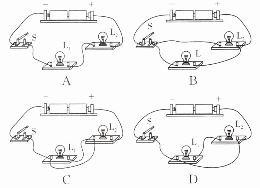 B [解析]图A中,开关S闭合后,电流的路径只有一条,小灯泡L₁、L₂串联,故A错误;图B中,开关S闭合后,电流的路径有两条,小灯泡L₁、L₂并联,故B正确;图C中,开关S闭合后,小灯泡L₁被短路,故C错误;图D中,开关S闭合后,电源被短路,故D错误.