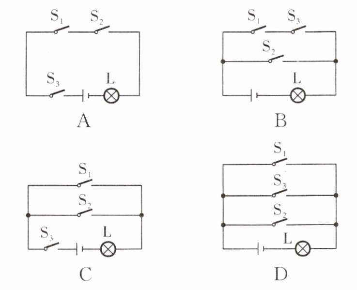 C [解析]由题意可知,指纹开关S₁或密码开关S₂均可以解锁,锁定开关S₃断开时暂停手机解锁功能,则指纹开关S₁和密码开关S₂可以独立工作、互不影响,即二者并联,且锁定开关S₃位于干路,然后与灯泡、电源组成电路,故C符合题意,A、B、D不符合题意.故选C.