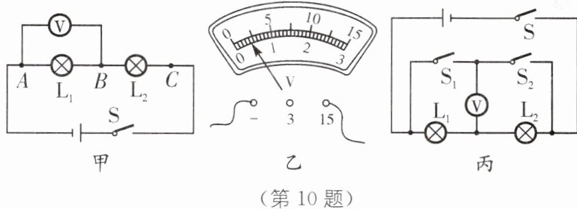 (6)小明认为用一块电压表分别测$L_1$两端的电压和$L_2$两端的电压时,需要对电路进行改接,为了不反复拆接电压表,他设计了如图丙所示的电路.他的思路是闭合开关S和$S_1,$电压表测$L_1$两端的电压;闭合开关S和$S_2,$电压表就可以测$L_2$两端的电压.这种设计思路是