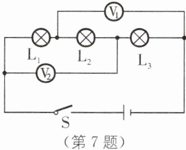 7. 在如图所示的电路中,电源电压为12V,闭合开关S后,电压表$V_1$的示数为7.5V,电压表$V_2$的示数为9V,则$L_2$两端的电压为(