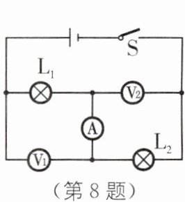 8.(2023·黑龙江齐齐哈尔期中)如图所示,开关S闭合时,电压表$V_1$的读数为4V,电压表$V_2$的读数为6V.如果把电压表$V_1$换成电流表$A_1,$电压表$V_2$换成电流表$A_2,$电流表A换成电压表V,则电压表的读数为(