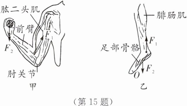 15.D [解析]用手托重物时,肘关节处可以视为支点,肱二头肌对前臂杠杆的牵引力使得杠杆转动,是动力,由图甲知,动力臂小于阻力臂,因此手托重物时,可视为费力杠杆,故A、B错误;由图乙可知人踮脚时绕着O点转动,腓肠肌对足部骨骼的牵引力F₁使得杠杆转动,是动力,此时动力臂大于阻力臂,可视为省力杠杆,故C错误,D正确。